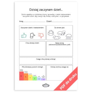 Karta pracy „Dzisiaj zaczynam dzień…” to praktyczne narzędzie, które pomaga dzieciom w wieku 7–14 lat oraz ich rodzicom świadomie rozpocząć dzień. Przeznaczona jest do wielokrotnego użytku. Zawiera pytania, które zachęcają do krótkiej porannej refleksji, pomagając zrozumieć, jakie czynniki mogą wpływać na nastawienie i plany na cały dzień.