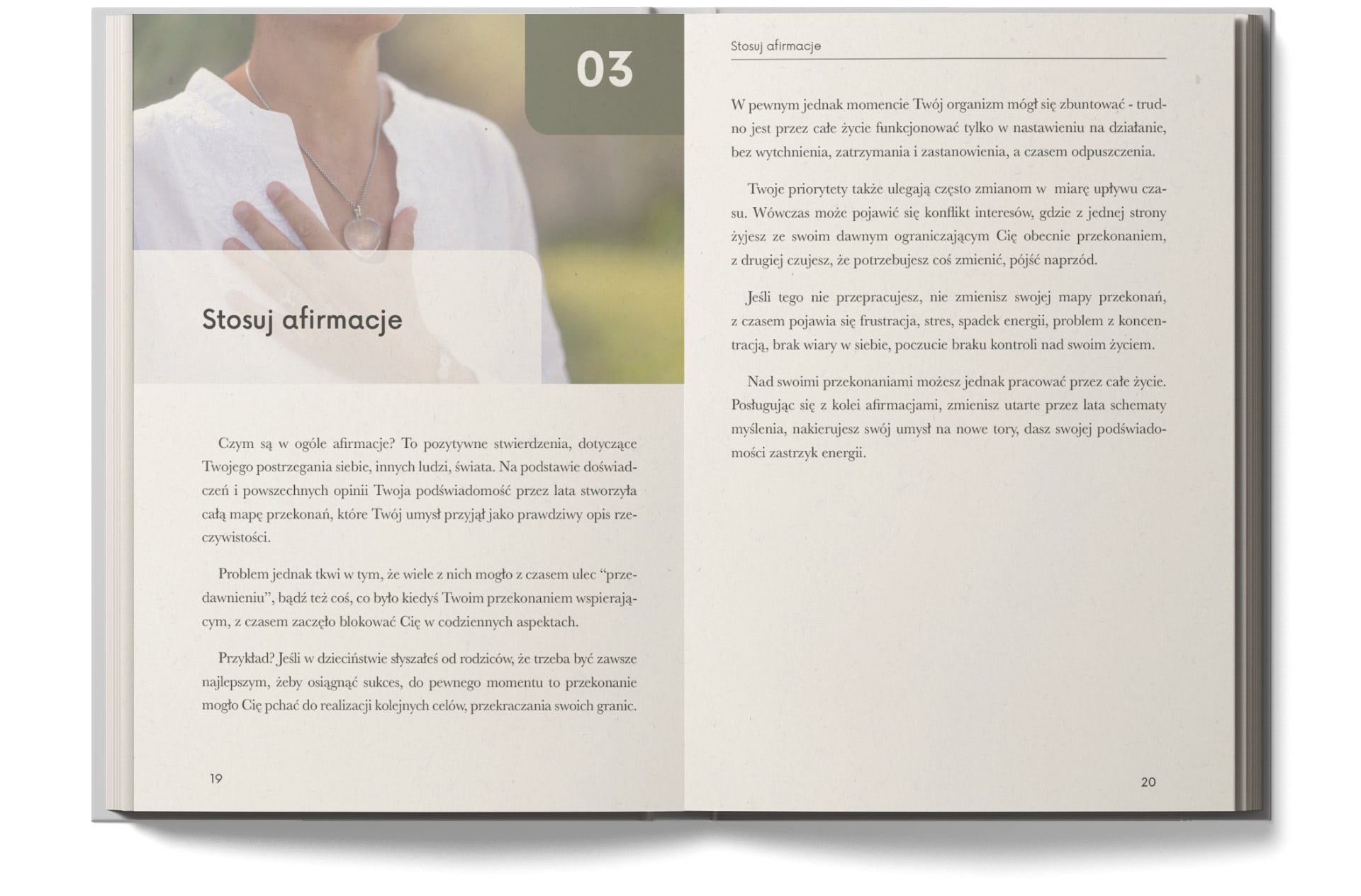 Rozdział o afirmacjach pomaga przyjrzeć się przekonaniom, które często towarzyszą nam od lat. Nie chodzi o powtarzanie pustych haseł, ale o świadome zauważenie myśli, które kiedyś mogły pomagać, a dziś zaczynają ograniczać. Ćwiczenia pokazują, jak stopniowo budować bardziej wspierający dialog z samym sobą.
