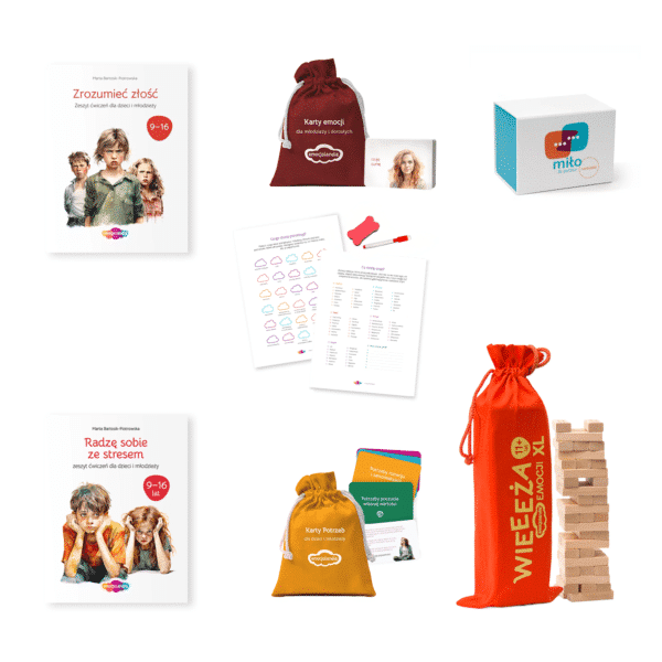 - Karty Emocji dla młodzieży i dorosłych (1 egz.) – narzędzie do rozpoznawania i nazywania emocji w postaci kart z ilustracjami nastolatków i dorosłych prezentujących różne emocje. Ułatwia rozmowę o uczuciach w kontekście szkolnym, relacyjnym czy domowym – do wykorzystania w gabinecie psychologa podczas warsztatów, terapii indywidualnych oraz grupowych.