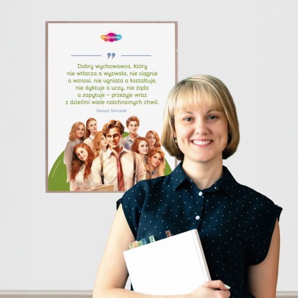 Plakat inspiracyjny z cytatem Janusza Korczaka „Dobry wychowawca, który nie wtłacza a wyzwala, nie ciągnie a wznosi, nie ugniata a kształtuje, nie dyktuje a uczy, nie żąda a zapytuje – przeżyje wraz z dziećmi wiele natchnionych chwil.” to hołd dla tych, którzy wychowują z sercem.