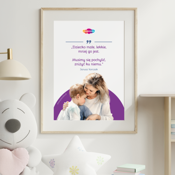 Plakat z cytatem Janusza Korczaka „Dziecko małe, lekkie, mniej go jest. Musimy się pochylić, zniżyć ku niemu.” to nie tylko dekoracja, lecz również czuła lekcja uważności i szacunku dla dziecka.