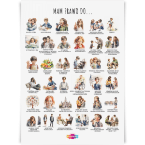 Plakat „Mam prawo do…” to autorskie narzędzie edukacyjne, które w przystępny sposób przedstawia 36 fundamentalnych praw dziecka. Wydrukowany na papierze premium plakat w wymiarach 50 × 70 cm jest przygotowany do samodzielnej oprawy, co umożliwia dopasowanie go do różnych przestrzeni. Jasna i czytelna forma sprawia, że jest nie tylko estetycznym elementem dekoracyjnym, ale przede wszystkim kluczowym źródłem wiedzy dla dzieci i dorosłych.