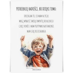 Zamów plakat „Potrzebuję tych emocji: radość” już dziś i pomóż dzieciom odkryć emocje, zrozumieć je oraz nimi zarządzać w sposób, który wspiera ich zdrowy rozwój emocjonalny.