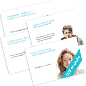 - Można je wykorzystywać samodzielnie – jako dziennik refleksji lub narzędzie do pisania, np. raz w tygodniu wybierając kartę i zapisując odpowiedź w zeszycie albo notesie.