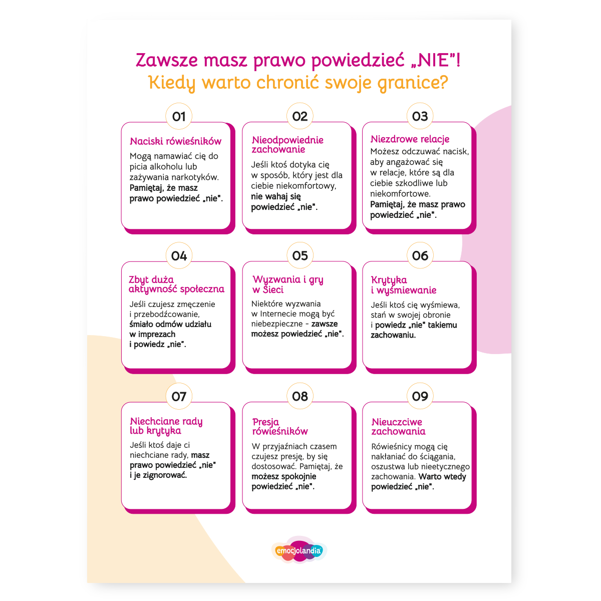 Plakat ma na celu przypomnienie młodym ludziom o ich fundamentalnych prawach emocjonalnych, takich jak prawo do wyrażania uczuć, odmowy czy bycia wysłuchanym i szanowanym. Jest to inspiracja do refleksji nad własnymi potrzebami oraz poczuciem własnej wartości. - „Zawsze masz prawo powiedzieć NIE! Kiedy warto chronić swoje granice?”