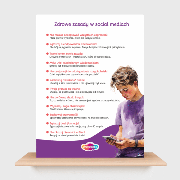 - Edukacja w obszarze mediów społecznościowych: plakat z zasadami dotyczącymi korzystania z social mediów przypomina dzieciom i nastolatkom o odpowiedzialnym zachowaniu online, pomagając budować bezpieczne nawyki. Zwraca również uwagę na to, że nie będąc online, także należy stawiać granice.
