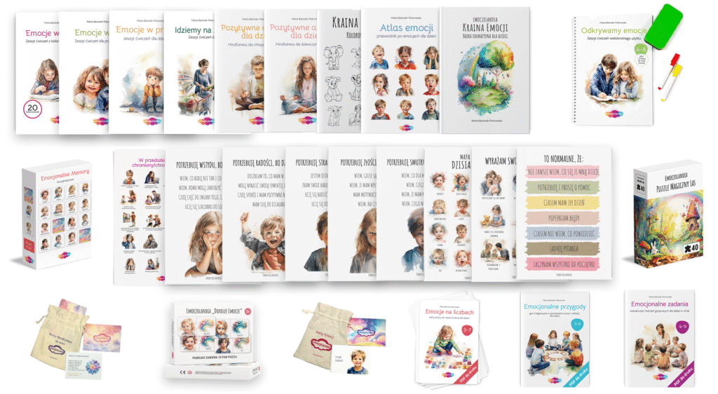 - gotowe narzędzia do pracy z emocjami – scenariusze zajęć, karty, zeszyty ćwiczeń, gry i pomoce dydaktyczne,